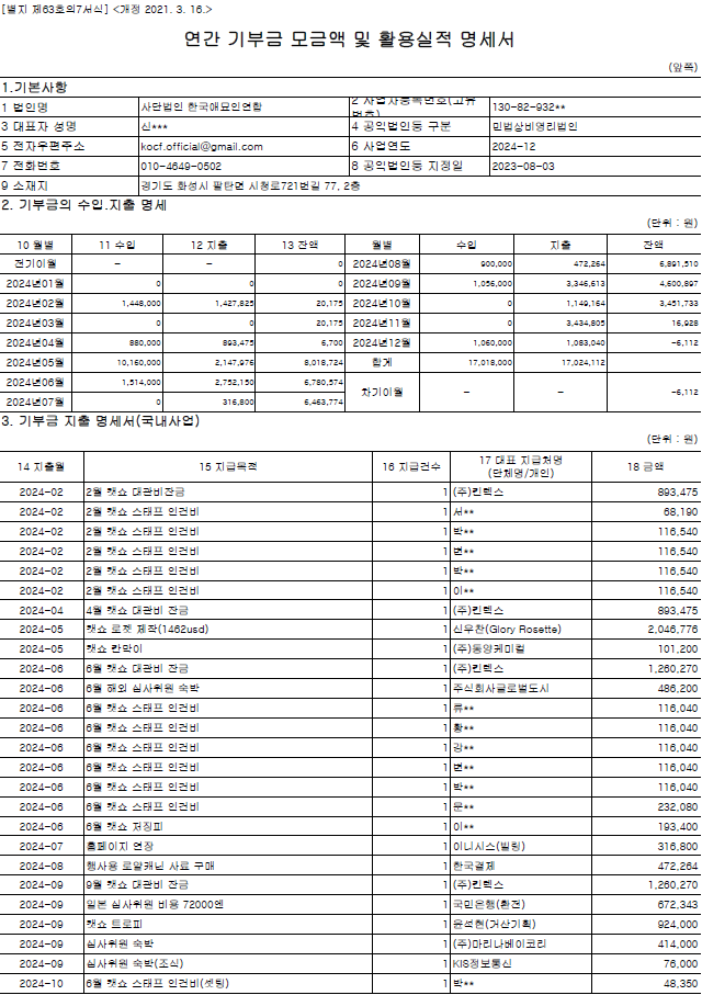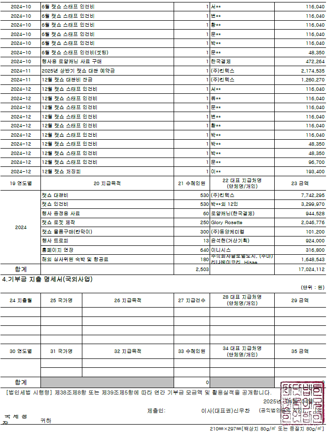 2024년 연간 기부금 모금액 및 활용실적 명세